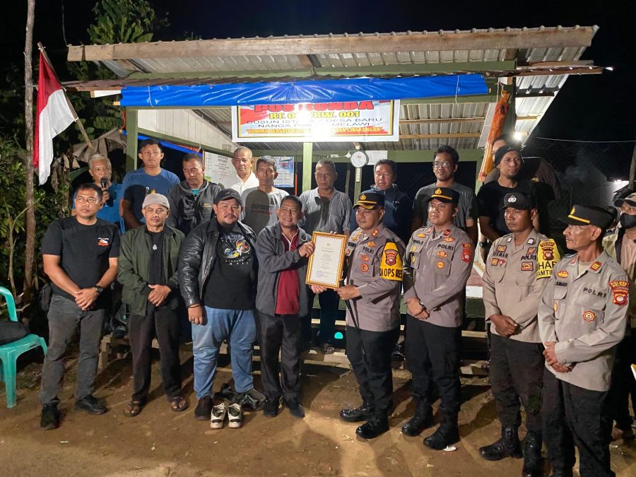 Melawi – Kapolres Melawi AKBP Harris Batara Simbolon menyerahkan piala dan piagam penghargaan dari Kapolda Kalimantan Barat kepada Satkamling Desa Baru, Kecamatan Nanga Pinoh pada Senin, (01/09/2025) pukul 22.00 WIB. :
